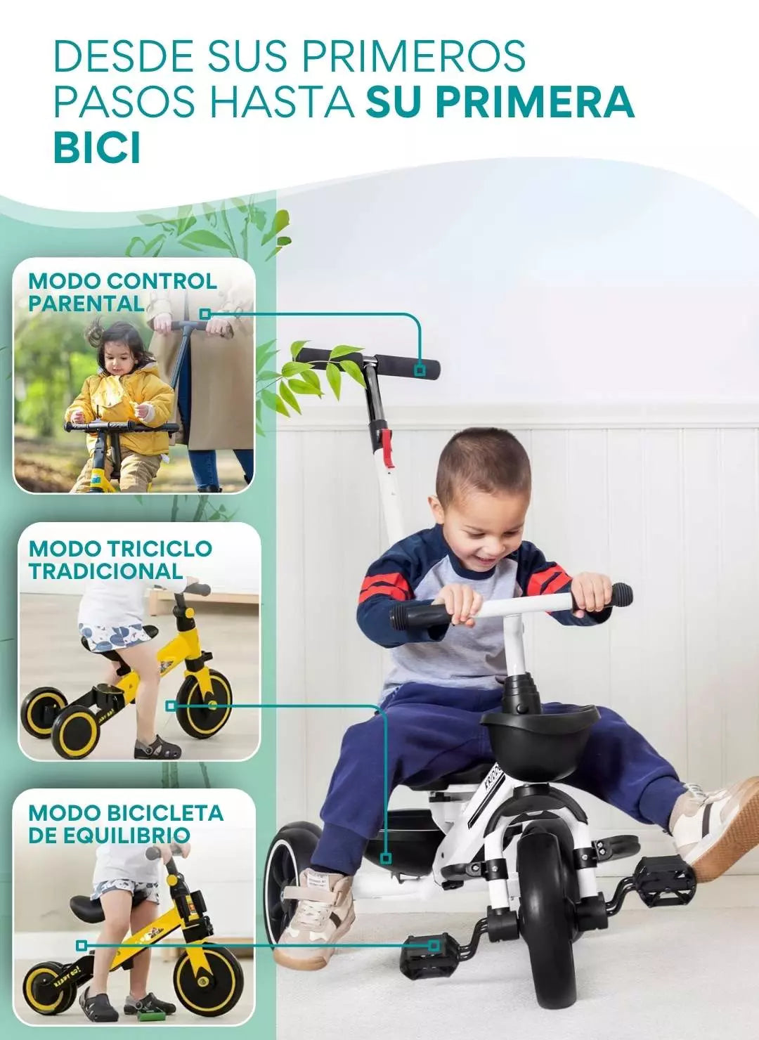 Compramos el triciclo para nuestro hija de 2 años y ha sido una maravilla. Empezó con el modo de empuje, y ahora ya usa la bici de equilibrio. Nos encanta porque podemos ajustarlo a su crecimiento